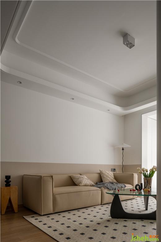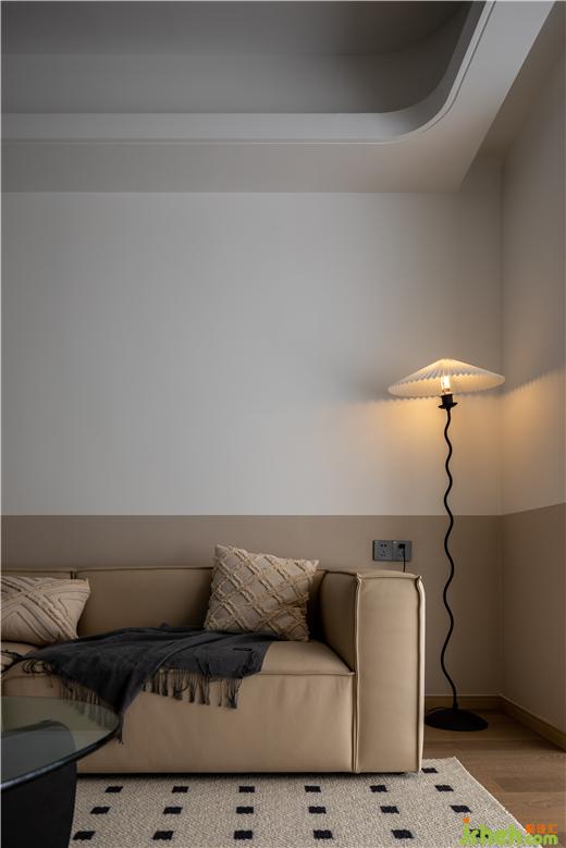 沙发、背景墙、电视柜的颜色相近,依靠色彩的延伸,酝酿出醇、静的视感,唤醒了内心对温馨的感知力。美的云筑家装设计自带镂空的边几,消弭了大体块沙发的笨重感,携手波浪身形的落地灯,让空间多了些视觉层次。