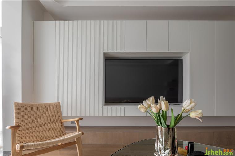 上下镂空的电视背景与左侧不对称设计的竖纹,在视觉上拉伸空间。平静舒缓的白色,美的云筑家装设计让客厅显得更整洁且具有呼吸感。地板、原木柜、休闲单椅都保持着材质本身的色泽,呼应了空间整体的调性。
