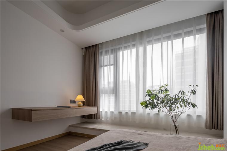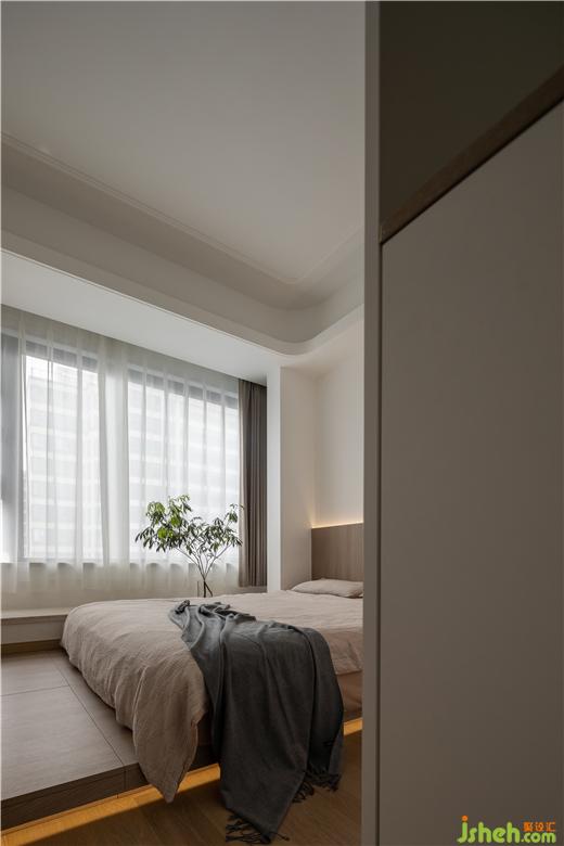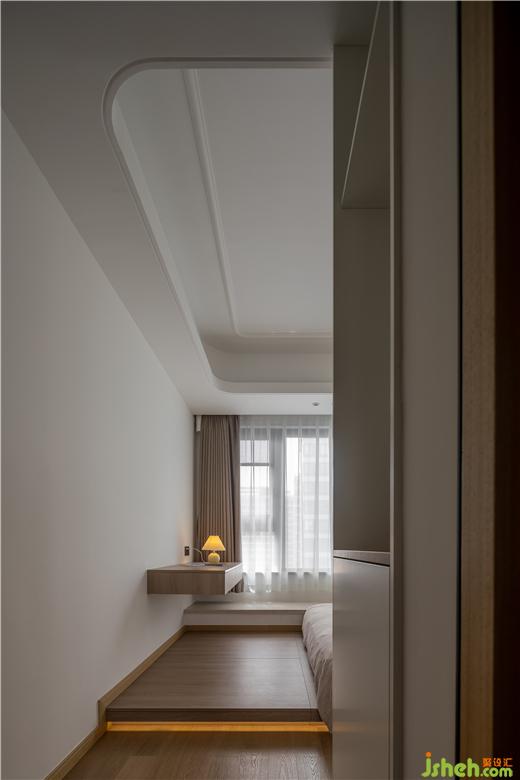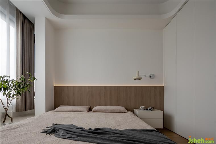 定制通顶衣柜,构筑双层地台,预留阅读区,促成L形动线,方便起居生活。采用木板上墙的手法,为睡眠萦绕安稳感,嵌入暖色灯带,以光书写空间层次,整个卧室给人一种素雅无华、舒适无边的感觉。