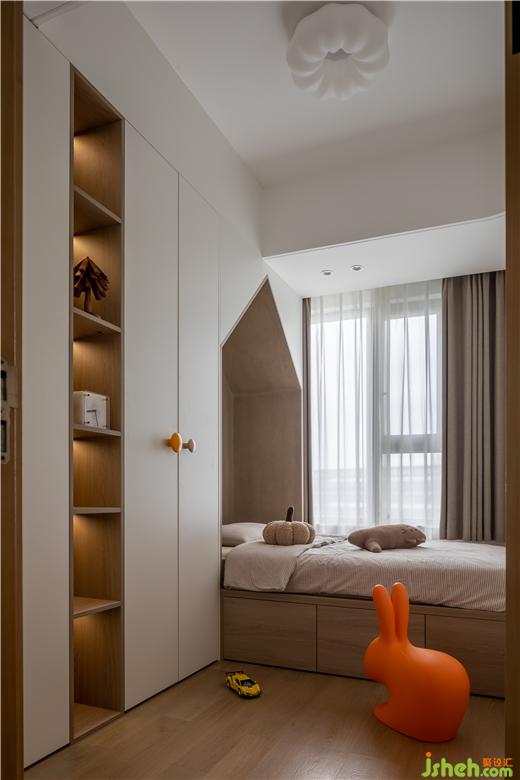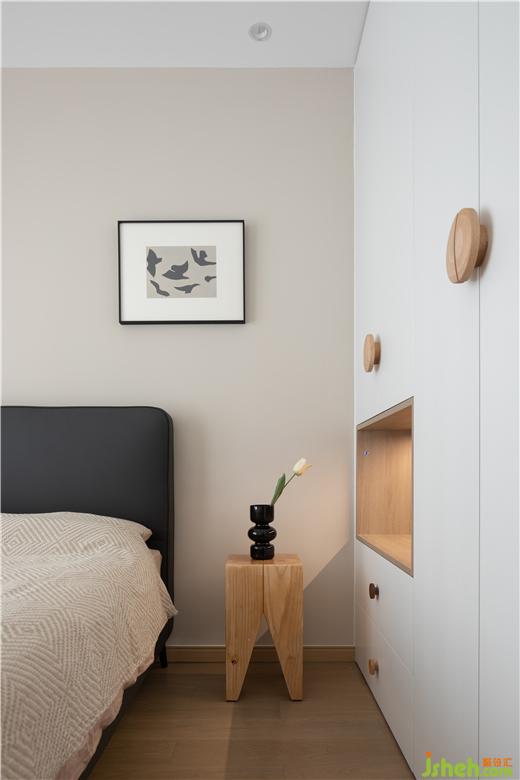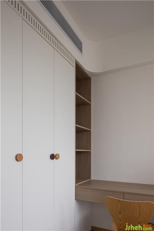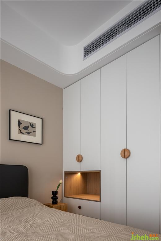 次卧右侧设计了一排衣柜,在靠近床头出预留出一个开放格,美的云筑家装设计以纯净白色作为衣柜的底色,再以温润的原木色在开放格和柜门把手处进行调和。取消了床头灯和壁灯,在开放格内洒下柔和的光线,通过细节的优化让空间更人性化。