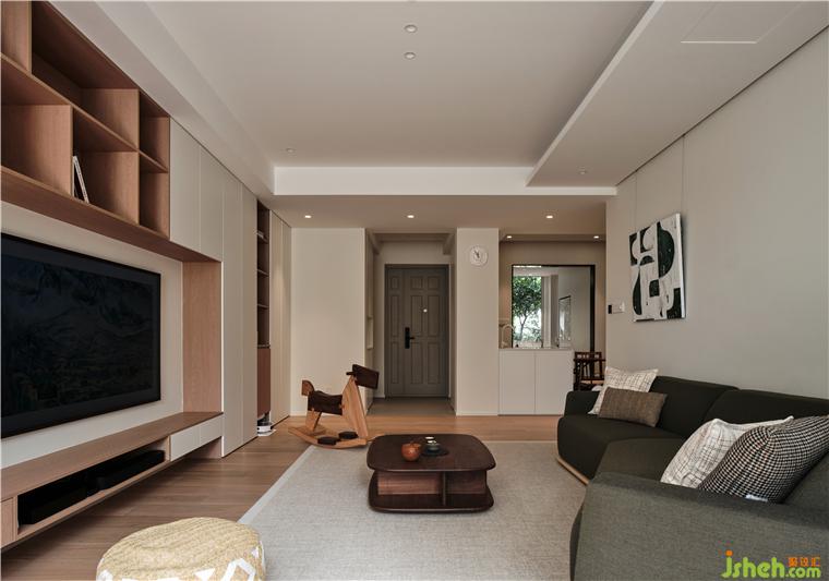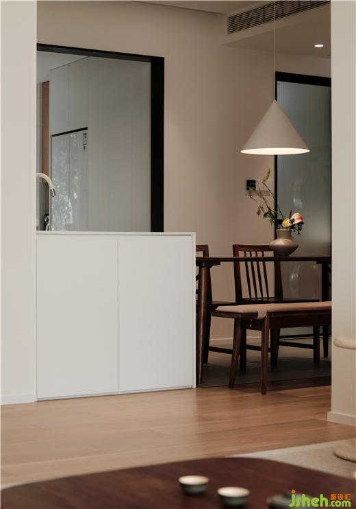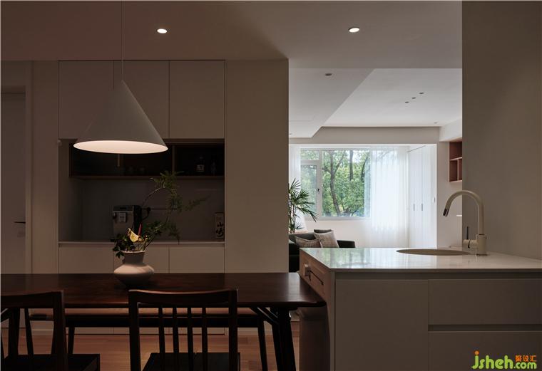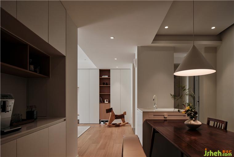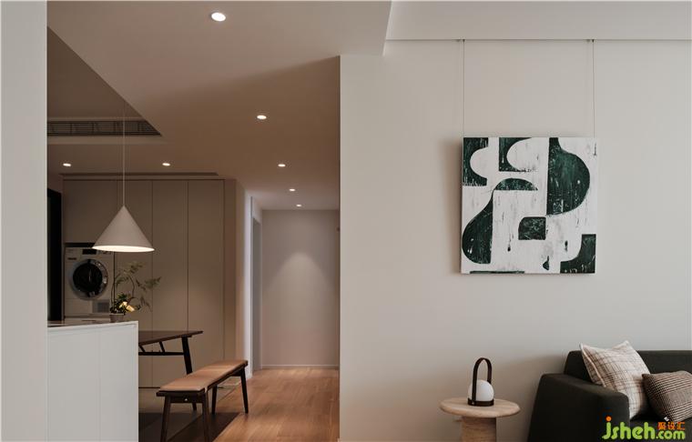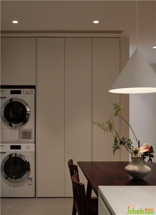 灯效,运用以点构线的手法强调了过道的独立性,散开的平顶之光与公区统一的木元素重塑空间感,将客厅、转折面、餐厅悄然串联,是使用仪式的交替,亦是居住情愫的流动。大胆突破空间功能,将洗衣区与就餐区合并,高效利用了立面尺度。