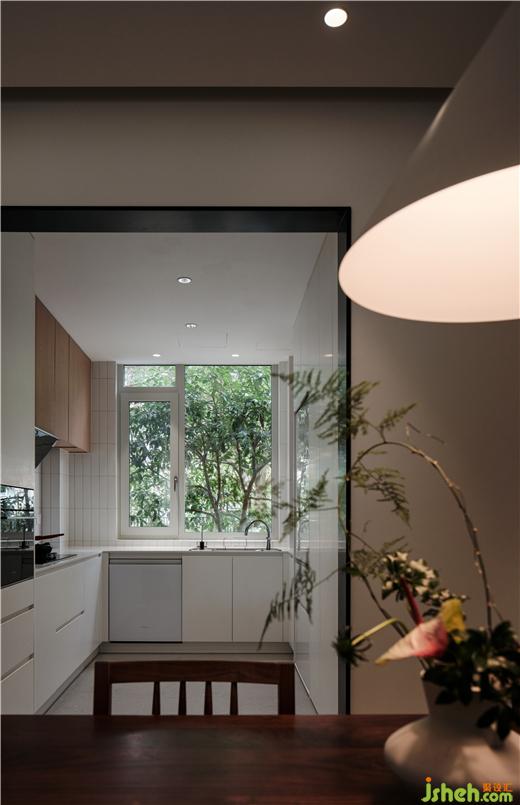 汲取客厅的造境方式,发挥开窗见“绿”的优势,强化空间的呼吸感与清新感。排布清洗、烹饪、存储的区域,搭配简约色调,共鸣回归自然的寓意。考虑空间转折上的明暗关系,勾勒黑色门框,让厨房自成一幅画,装点“画中人”与“画前景”。