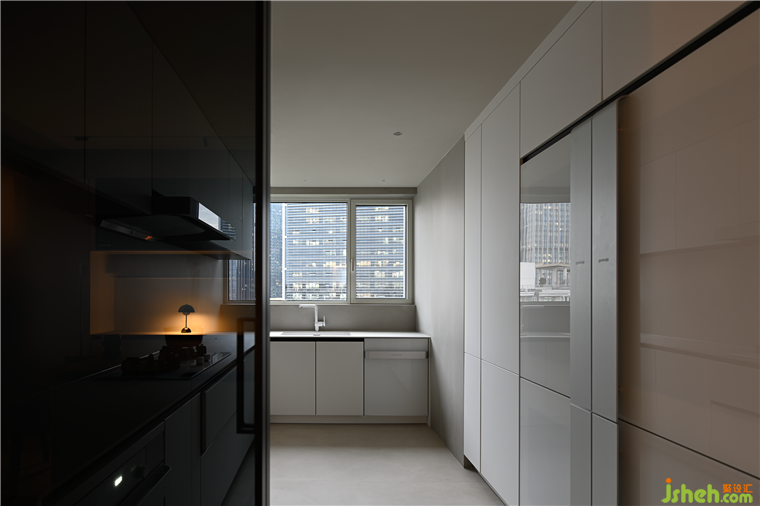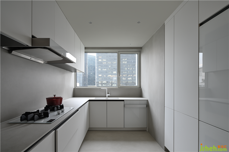纯白是厨房的底色,根据开窗的位置与比例,师惠花苑装修设计设置符合居住者身形的操作台面与活动流线,一目了然,方便清洁,随心收纳,提升烹饪享受,橱柜与玻璃柜隔空互动。