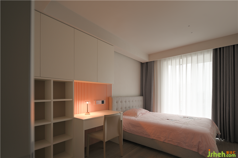 大女儿房,用一抹珊瑚粉吸引目光,甄选中灰与乳白调和空间色温,实现冷感与暖感的平衡。