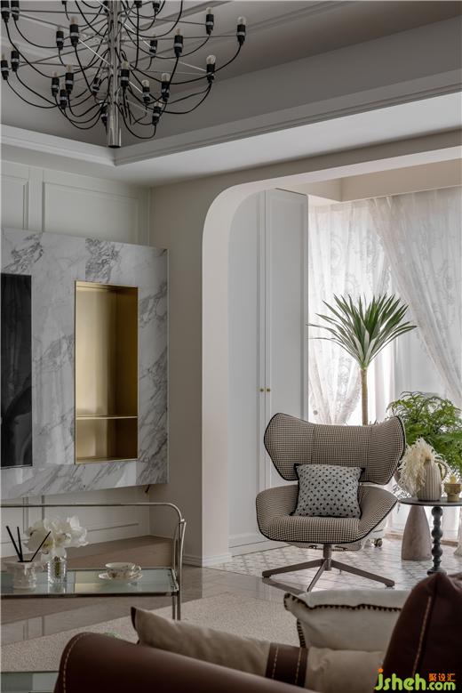 “从内心深处,我们是希望房子能变得有个性一些的。”在客厅与阳台空间的划分上,弧线是比直线更具哲理感的选择。天鹅港豪宅设计艺术借由曲线呈现,也由对比产生。在沙发、可移动边几、双层梦幻帘之间,形成了空间量感上的不对称。