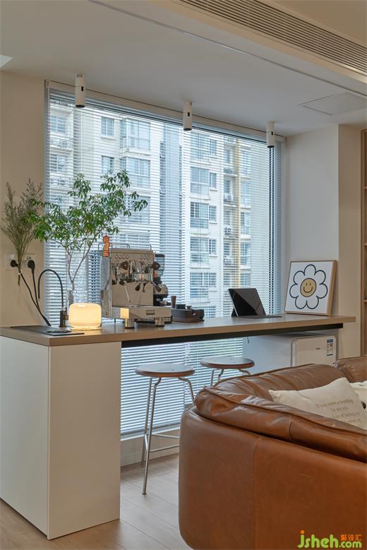 落地窗整体通明,配以节奏平衡的百叶帘,多了几分朦胧意趣,为时光静静赋能。装修设计贴合空间轮廓而设的造型,与沙发形成平行律动,拾取到舒适科学的细节动线,煮一杯咖啡,点亮暖光,唤醒绿叶生机,也焕活我们的内心。