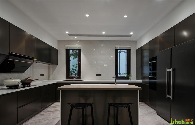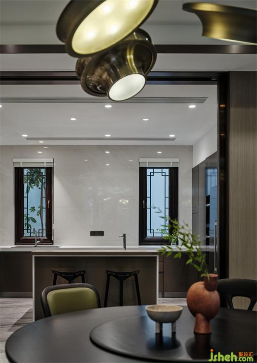 以岛台为中心,打造中西合并的烹饪环境,保留传统窗花,搭配天然石纹与金属的质感,烘托出亲近烟火,却不失高雅格调的空间情态。