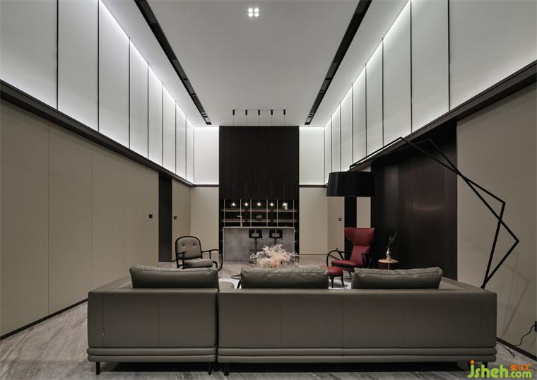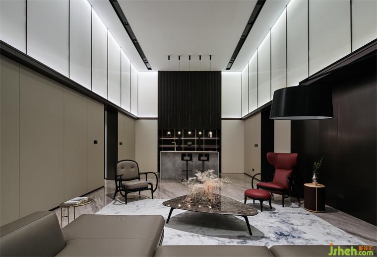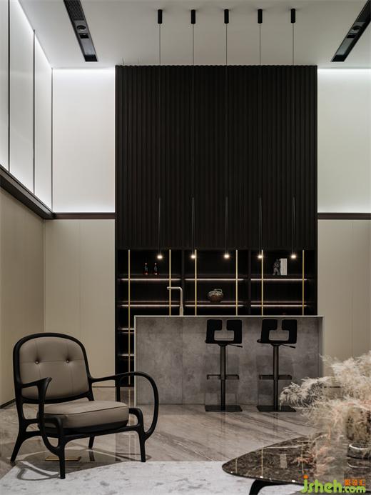 别墅装饰通过一脉相承的设计智慧,铺垫高雅的深色背景,融入格栅的艺术气质,回应着光点的浪漫感,恰好契合浅酌慢品的氛围。汲取清水混凝土的美,拓展水吧台的纯色细节,让个体与环境的关系更富层次。