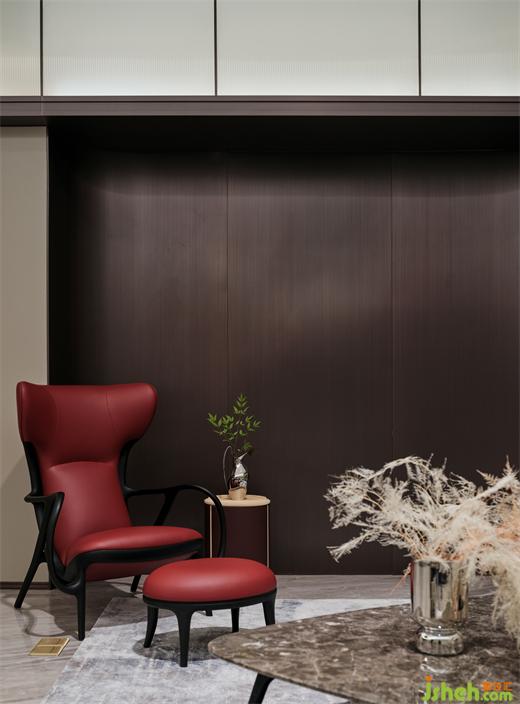 劲松于斜角与时光对语,散发勃勃生机;点缀轻盈朦胧的形态,隔空连接了自然意境;一抹赤豆红调,随心而雅。细腻的设计带我们领略美学韵致,静静地、慢慢地品阅生活散发的恬淡芬芳。