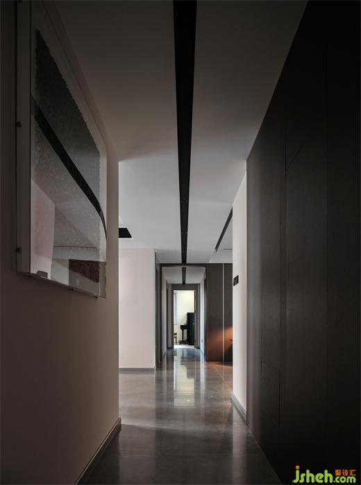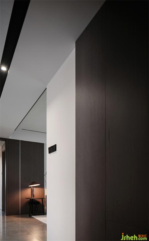 天花的宽面黑线,强调了多重纵深感,有断有续,使得左右两侧的场域不知不觉地静下来,酝酿舒怡气韵,由浅入深地观赏,再逢深浅相间的节奏美感,让生活可期。