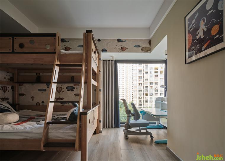 大平层装修设计依据空间尺度特征,摆置原木高低床,划分休憩区与书写阅读区。在细节处,甄选壁纸,萦绕出童真趣味,点缀探索太空的艺术画作,在生活中呈现出一家人对孩子的无限关爱。