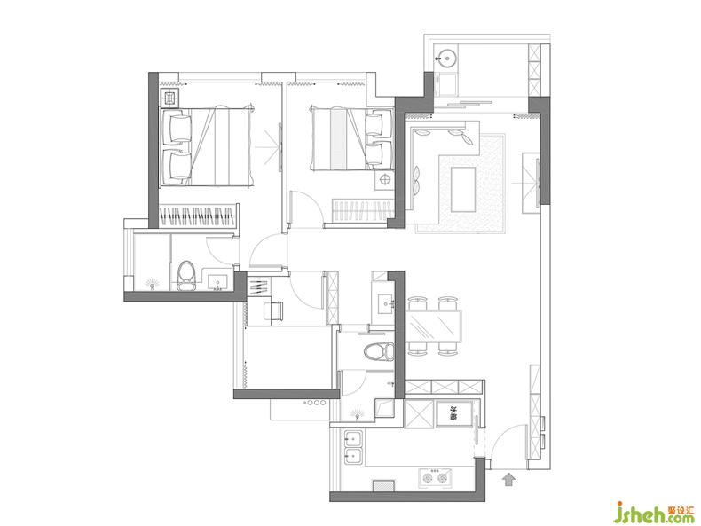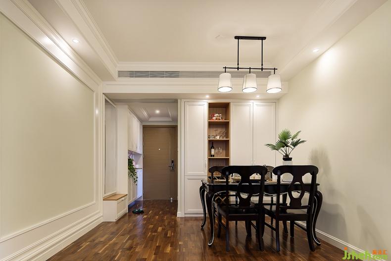 此外,墙面装饰做了干净利落的线条造型,搭配上较深的木色地板,在灯光的照耀下,散发出的光泽,像升温的情感。