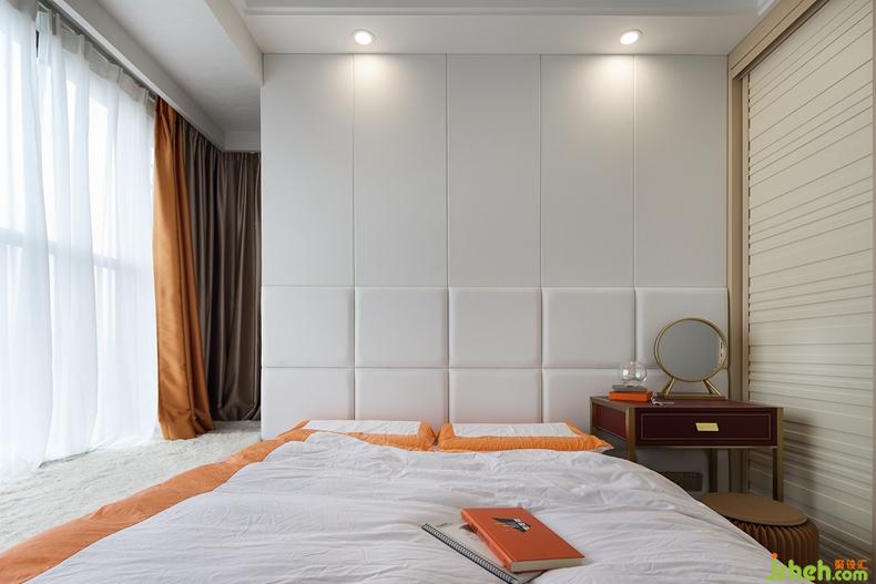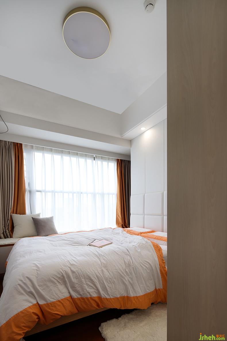 主卧以橙色+白色的床品,搭配同色系窗帘,营造出整体清爽、轻松的感觉。飘窗偶有阳光串门,可以一边慵懒散躺,一边享受日光浴。