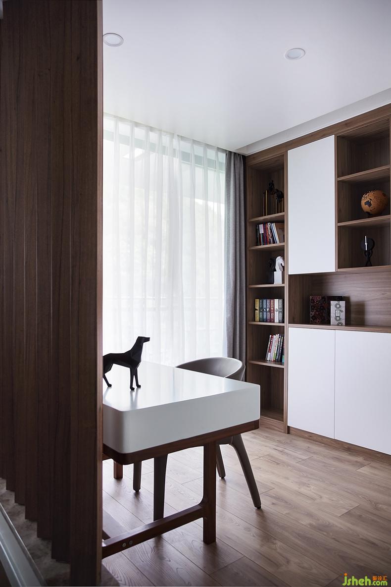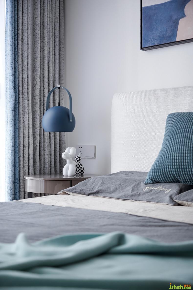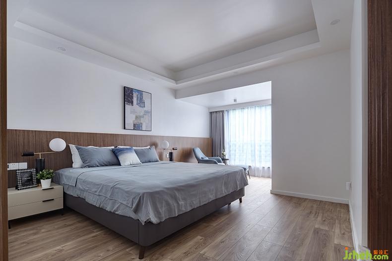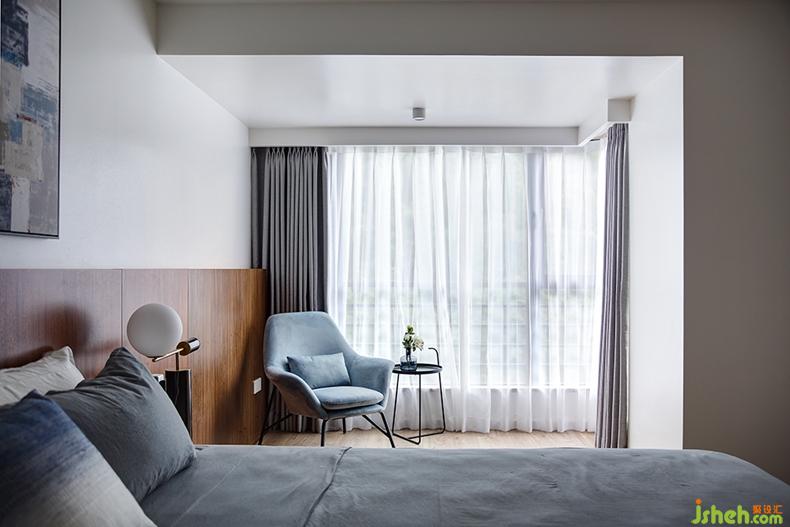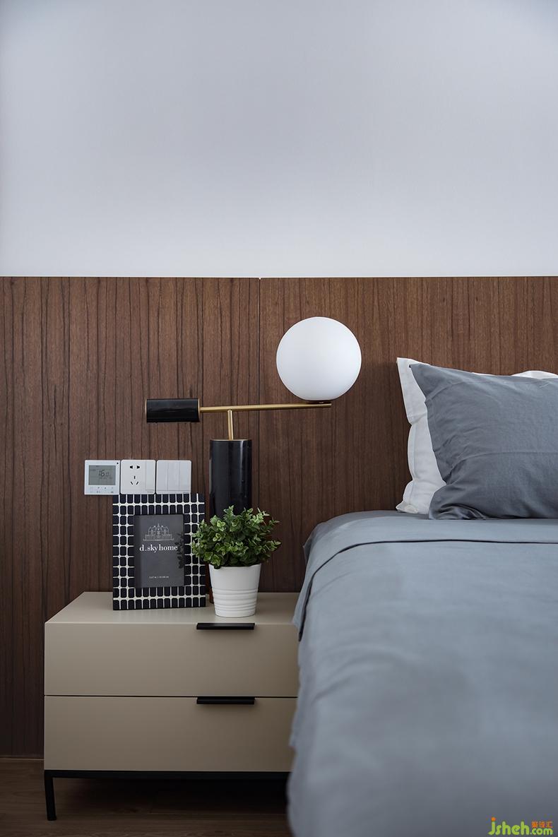 适当留白是当代艺术中的常用手法,主卧室便是如此,以静谧的灰色床品搭配半高的木色护墙板,其上挂幅同色系的撞色挂画,一切点到为止,没有过于繁杂的装饰,慵懒舒适的氛围渐渐浓厚,给人带来无限享受。