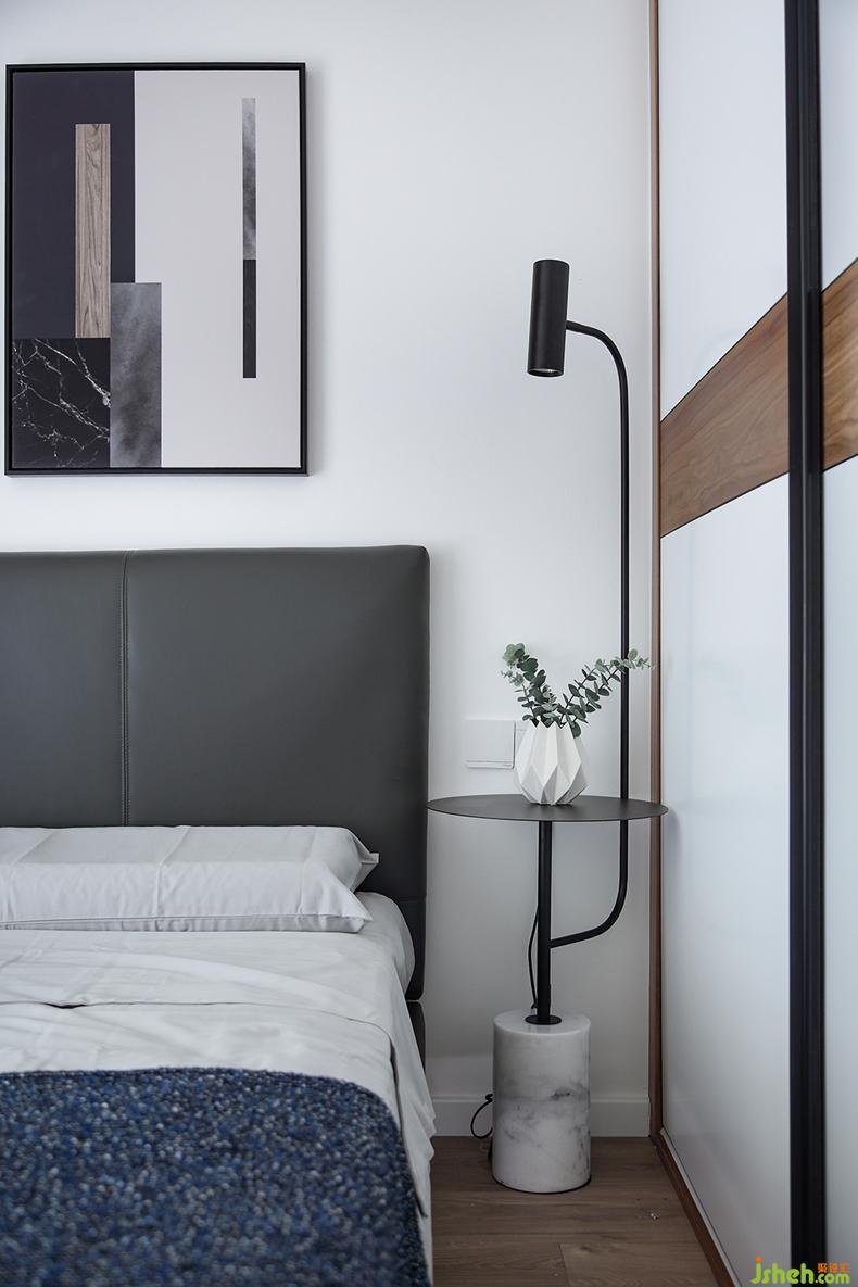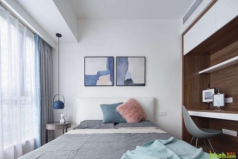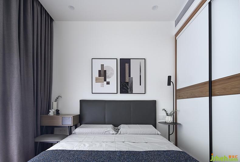 柔和的灯光,舒适的床品,只在角落随性摆放一些小摆件,床头挂上两幅艺术挂画。紧靠床边的一体柜既可以当作衣柜又可以作为书桌,实用中不乏小巧思。各元素之间交相呼应,空间顿时温馨起来了。
