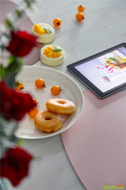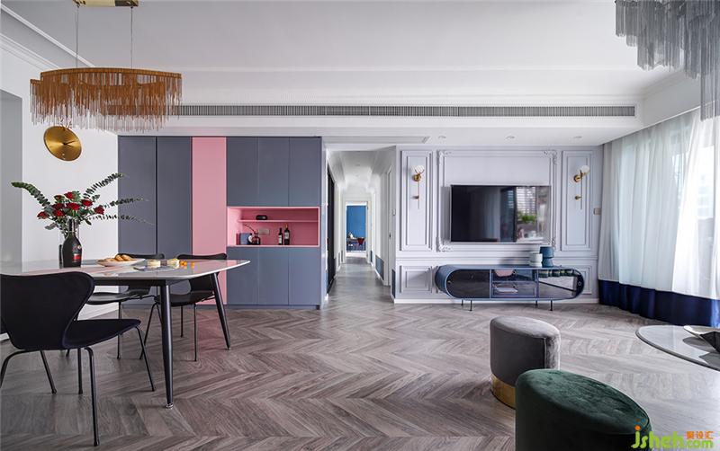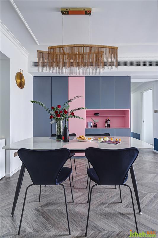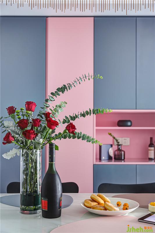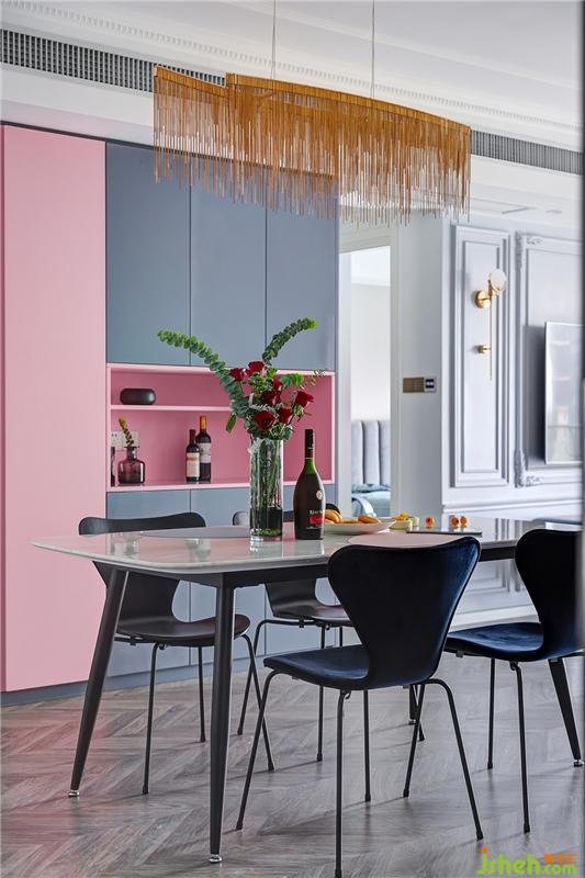 用餐想要舒适又有颜值,储物功能不可或缺。餐厅另一边是到顶的定制柜,粉色与深灰色相间,流畅的线条设计没有任何多余的装饰,十分高级。