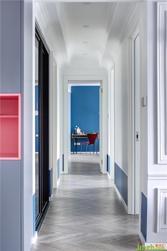 原房为两套打通的双拼户型,过道梁位偏低,索性采用跌级线条的处理手法将梁位弱化,使整个过道独自成景。同时,巧妙地运用蓝白分色,丰富视觉层次感,有通向殿堂的仪式感。