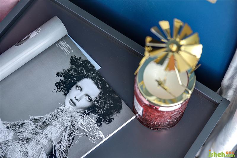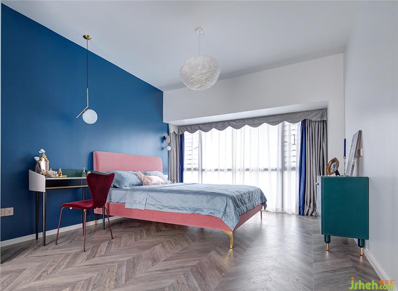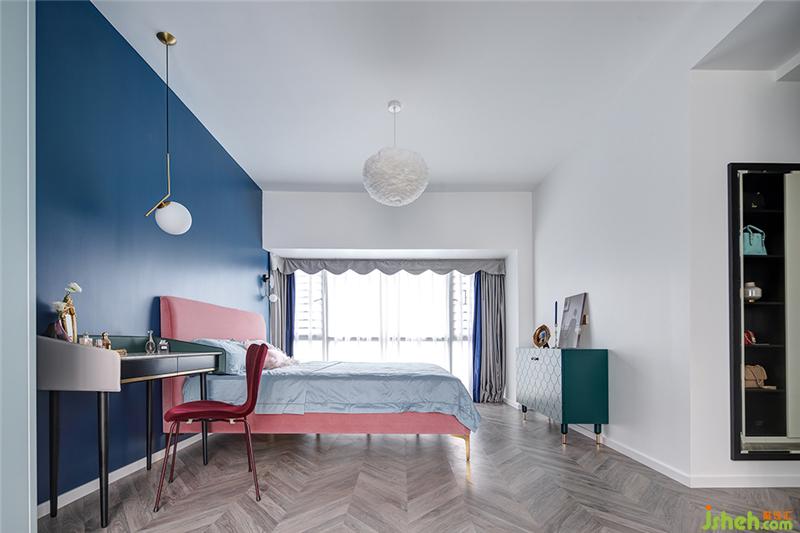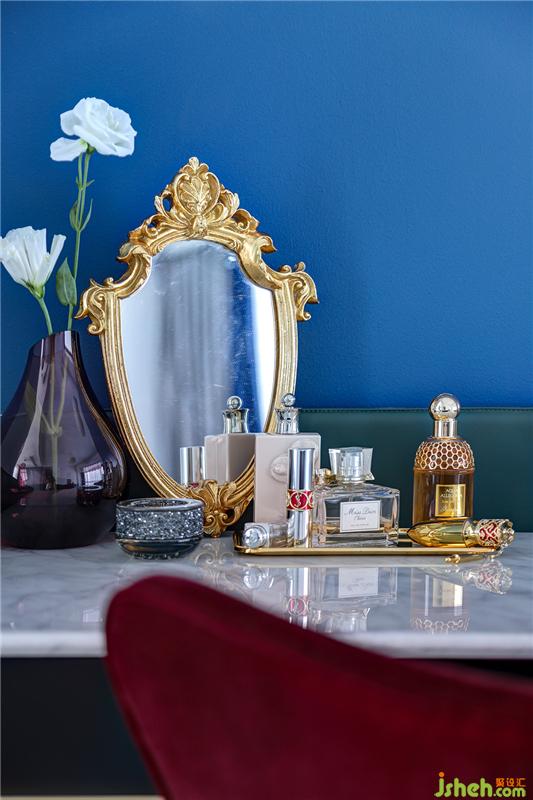步入主卧,最令人拍案叫绝的是粉与蓝的碰撞!当低饱和度的烟粉色遇上浓烈明亮的蓝色,对比鲜明却又和谐融洽,展现出张扬的浪漫。形似钢琴的墨绿色梳妆台映入眼帘,无论是皮边与大理石台面的结合,还是黑色木制品与金属装饰的搭配,都堪称完美,细细品味,那是大理石与金属碰撞的轻奢美。室内设计师