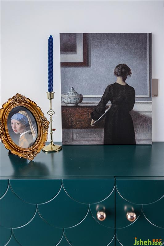床尾的墨绿色鱼鳞纹斗柜也甚有韵味,金属球体拉手和别致的金属脚更是让人心生欢喜。其上预留了插座位,可直接摆放电视,充当电视柜。