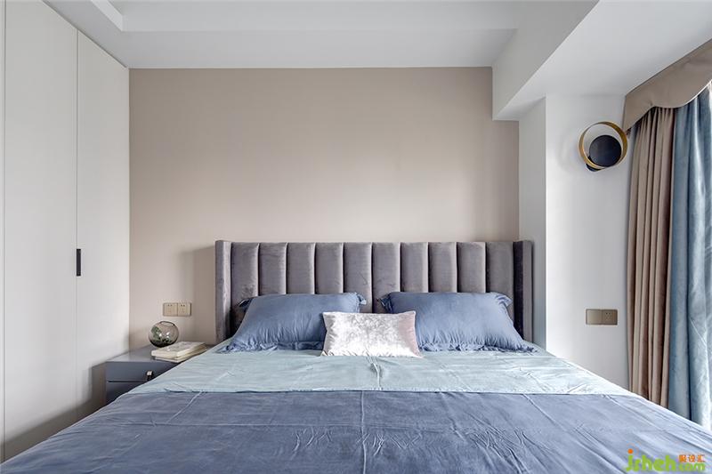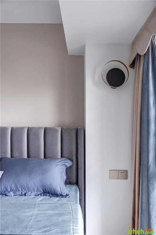 次卧是为父母准备的,奶茶色墙面配上灰色绒面软包床、雾霾蓝色床品、浅金色腰枕,温馨淡雅的色调将卧室空间打造得雅致文艺、闲适淡然。而床头那轻微突出的侧板,让人倍有安全感,令整个空间都生动起来。