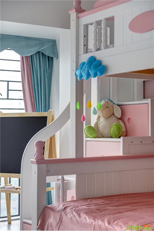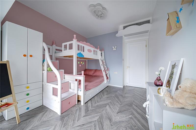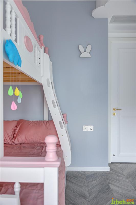 漂浮的云朵形空调挡板、软萌的小兔子壁灯、魔法城堡样式的上下床……在浅灰色与粉色的儿童房里,仿佛置身于梦幻的童话世界中,甜美而浪漫。
