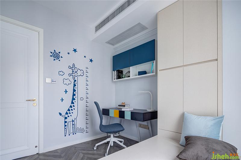 浅蓝色墙面搭配暖白色榻榻米,清新柔和的空间色调让书房更觉舒适。而门边的卡通身高墙贴也十分实用,随时记录着孩子的成长。