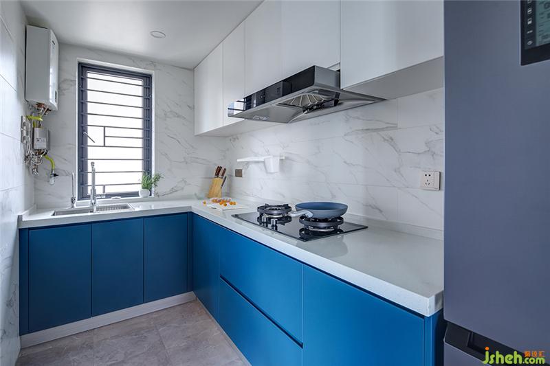 蓝色,无论是天空蓝、海水蓝、宝石蓝还是孔雀蓝,都代表着一种洁净美好。如果厨房也用上一抹蓝色,想必也只能沉迷做饭不可自拔了!蓝白色橱柜搭配石英石台面,结合纹理瓷砖和灰色地砖,颜色明亮而不繁杂,更凸显清新雅致。