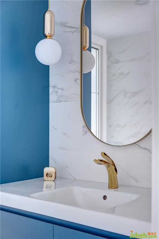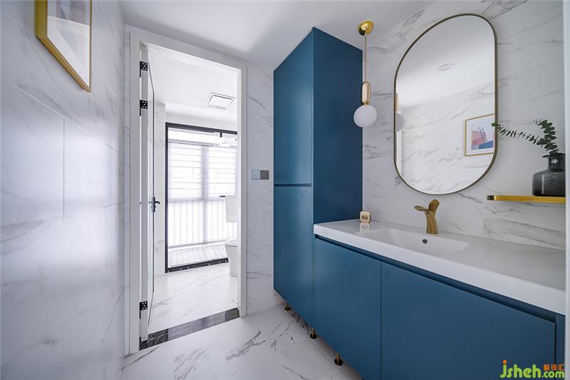 白色简单却能搭配所有颜色,而且,还能让卫浴间更清爽、开阔,搭配蓝色浴室柜与金色小五金,打造典雅大气之感。三分离的空间设计也极为讲究,打造酒店般的体验,提升使用品质。
