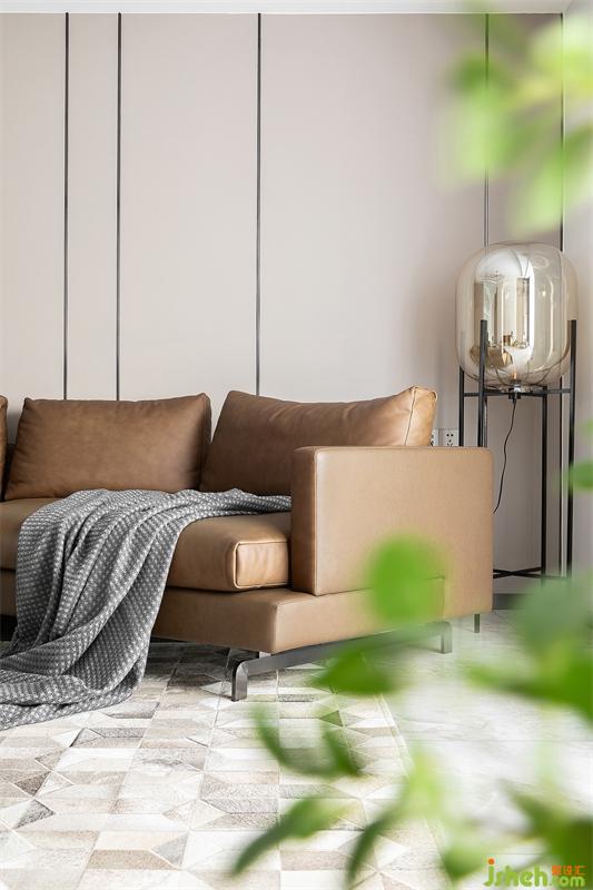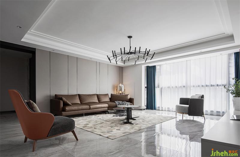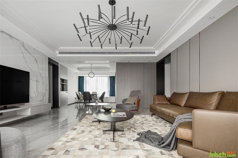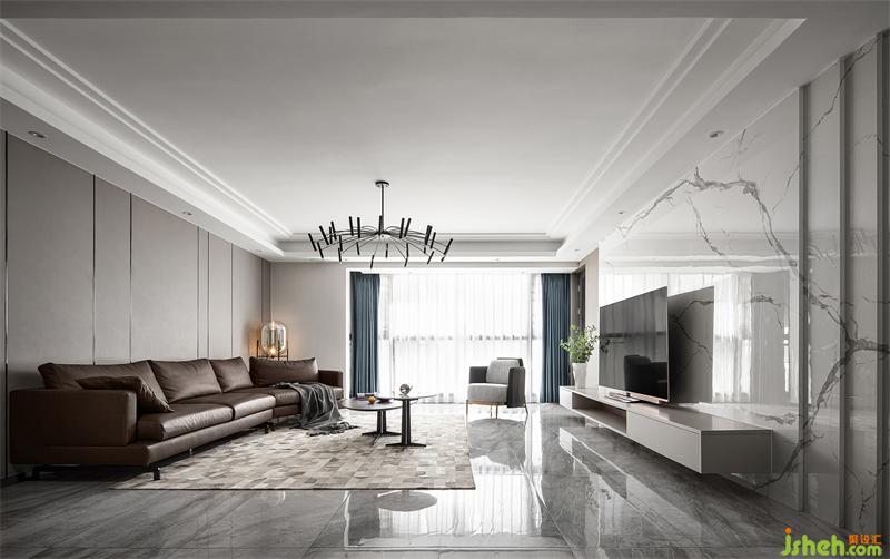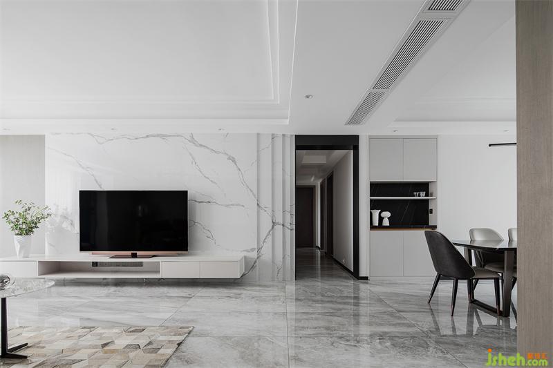 室内以简练、优雅、舒适为设计核心,通过材质、色彩、线条等元素,构建清爽、舒适的生活空间。公共区域地面通铺大理石纹砖,天花以周边吊顶形式将空调与筒灯藏于其内,立面则以暖灰色皮质硬包与浅色大理石纹砖作为材质及颜色之间的碰撞,凸显空间开阔、大气之感。