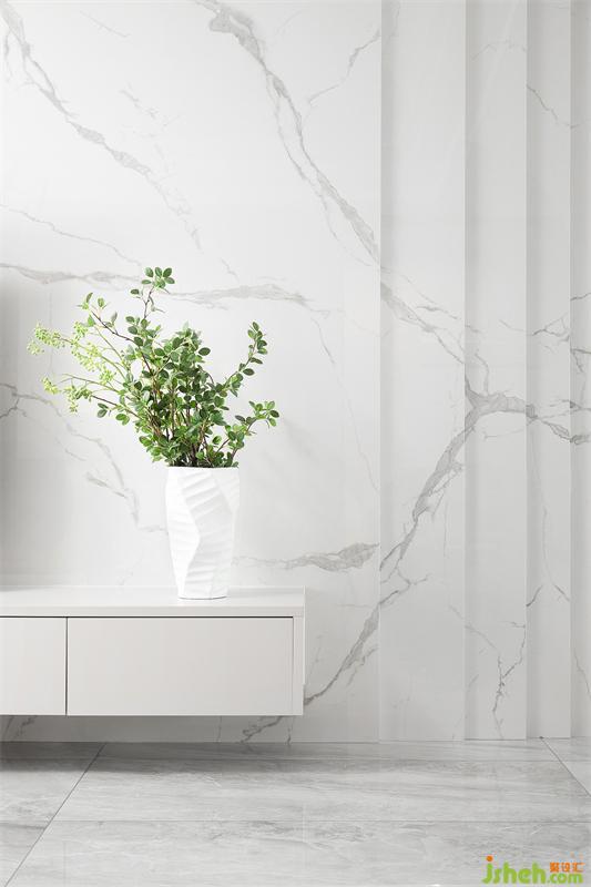 电视背景墙以大理石纹砖依次叠加并重组线条感为设计亮点。纹路自然延展、右侧恰好形成梯度线条,与定制的条形电视柜组合成立体的空间。清新的色彩搭配让室内尽显轻松、静谧,小瓶绿植更让空间充满舒适的居家氛围。