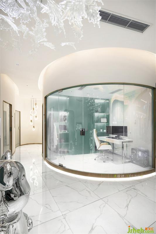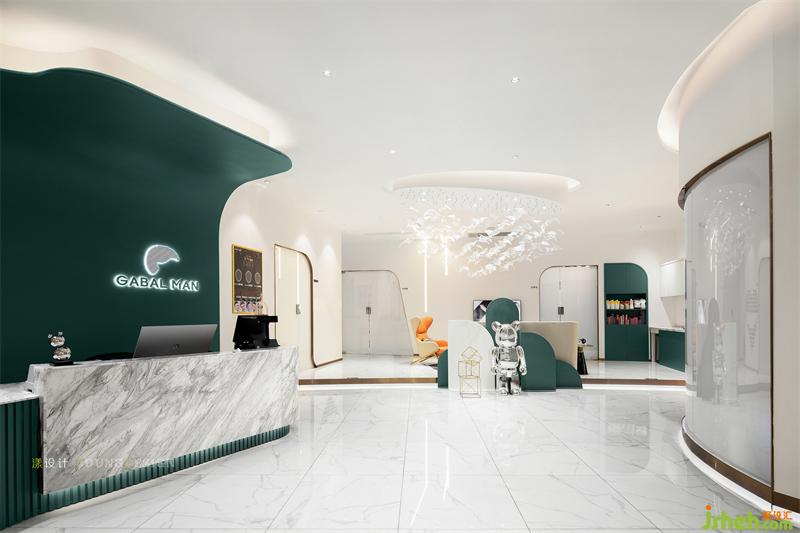 空间以纯净的白色作为主色调,搭配优雅神秘的复古绿,用色彩纯度形成的色块构成立面造型;以柔和流畅的弧形带动视线转移,顺势而为的异形造型则将空间巧妙贯穿;搭配电子雾化玻璃和多重光源,打造时尚个性、优雅轻奢的商业空间。
