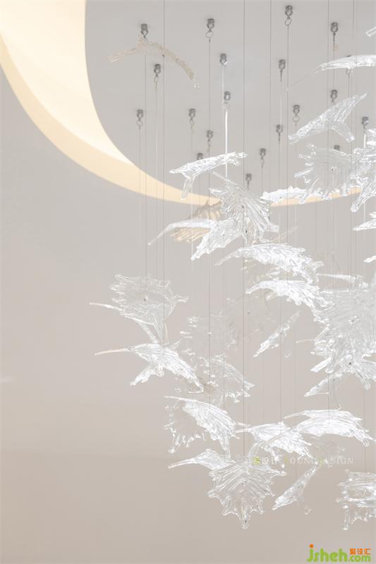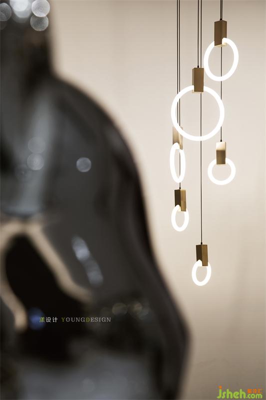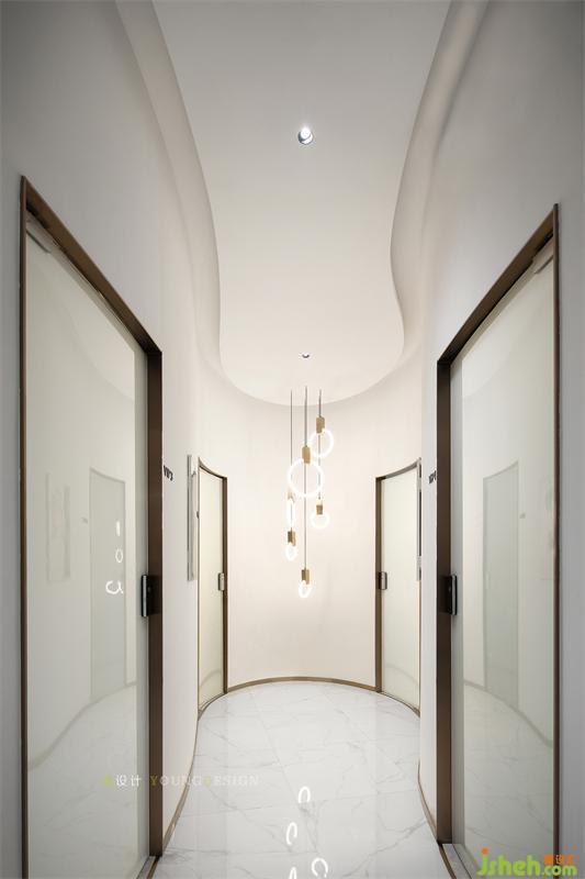 光滑透亮的大理石纹砖、晶莹通透的玻璃门、高级精致的金属元素,过道空间在环形吊灯的映照下,洋溢着干净灵动的气息。
