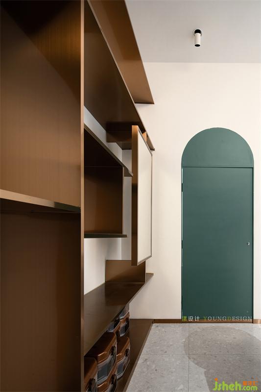 线条流畅的复古绿弧形石膏背景墙,与定制大理石+烤漆弧形前台的组合分外吸睛,传递出个性、自然、优雅的空间感受。