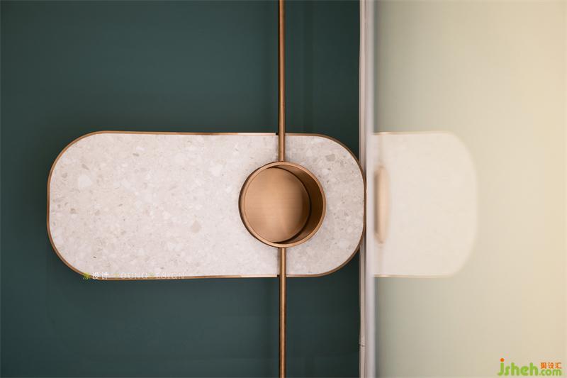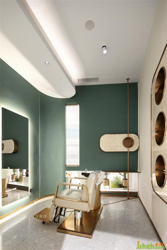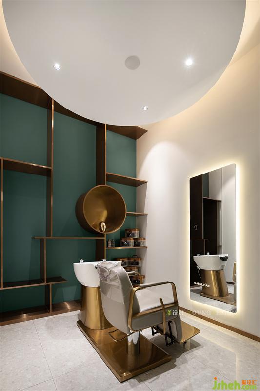 VIP室延续整体轻奢基调,以复古绿为主背景墙色,侧面设计了造型简约但实用的开放式金属置物架,必要的镜面也巧妙置入其中。家具的选择也十分讲究,强化了造型的简约性及金属色的相互呼应,营造出空间静谧、优雅的氛围。