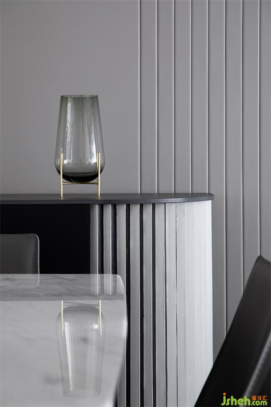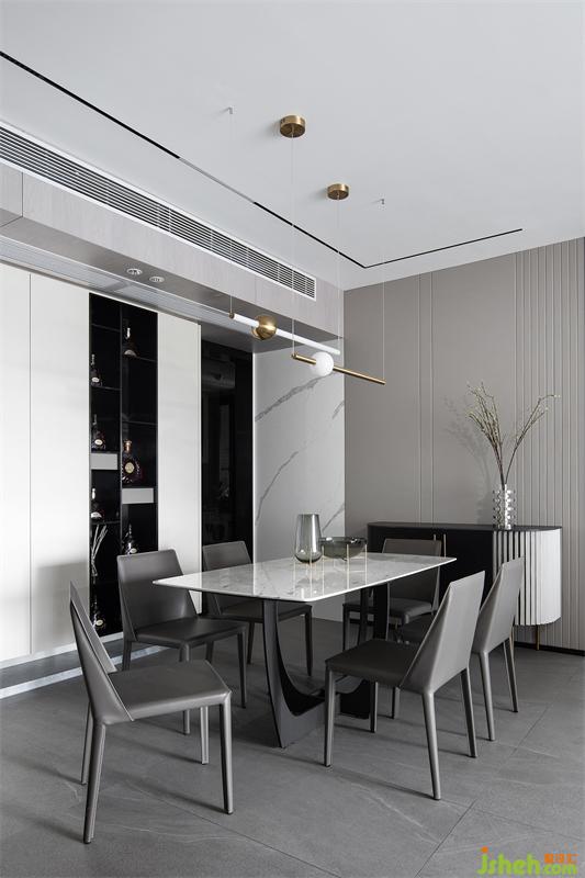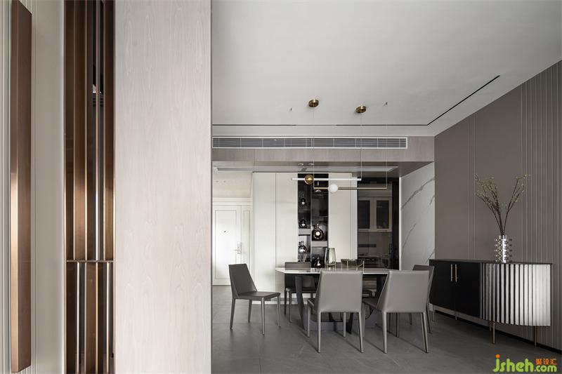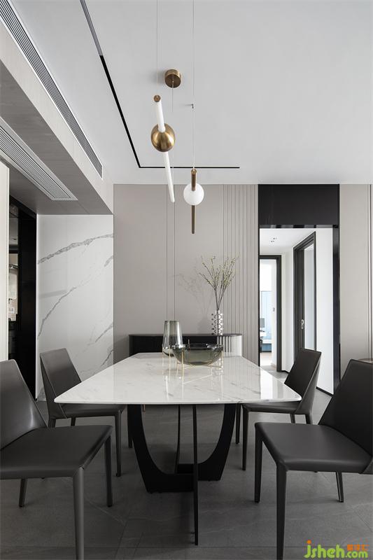 餐厅背景墙延续沙发背景墙的岩板+硬包材质组合,避免了单一材质的乏味。以硬包分缝线、线性几何吊灯、天花线条磁吸灯等线性元素作为装饰,同时,引导视线纵向延展,视觉上拉升空间层高,令空间更显高级、舒适。