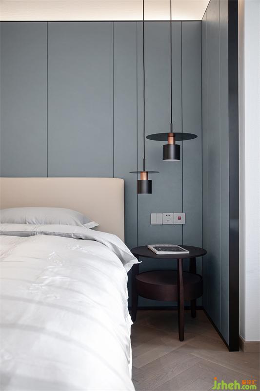 主卧背景墙半包围的造型也使室内洋溢着安全而温馨的氛围,搭配上方内藏的灯带和侧边的帽型吊灯,安睡好眠的空间浑然天成。