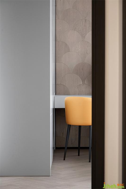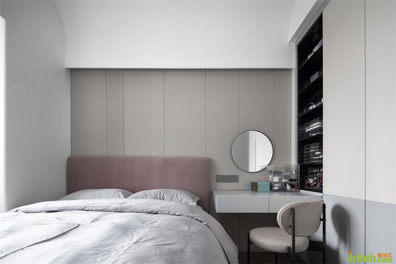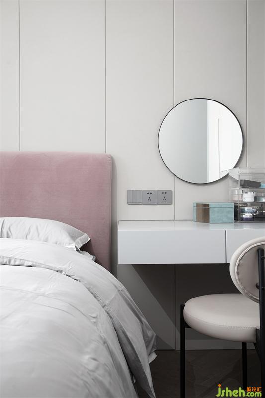 侧面定制的梳妆台也兼具床头柜的功能,外形延续整体现代简约的基调,以灰度传递精致生活方式。