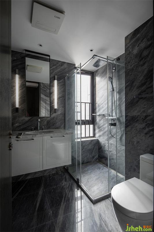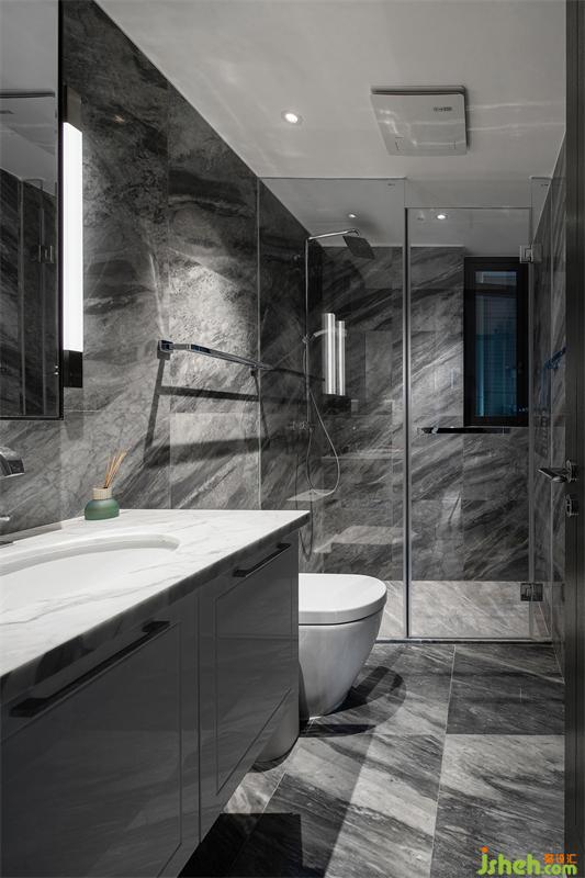 公卫墙地面通铺深色纹理的大理石,洁具选用白色简约经典款,淋浴房则采用极简的无边框款式,放眼望去,仅由黑白构成的卫浴间显得十分干净、通透。