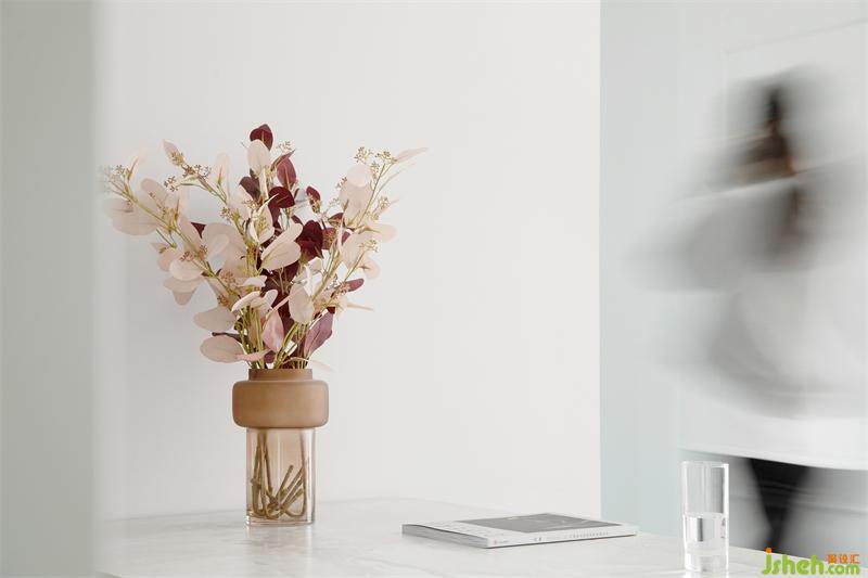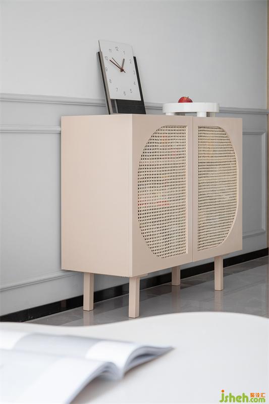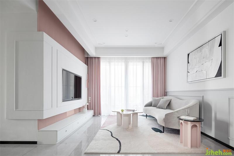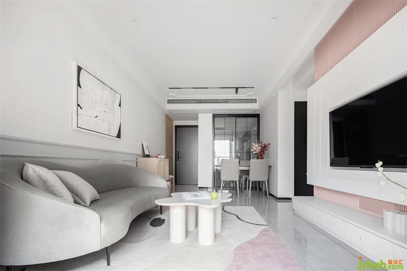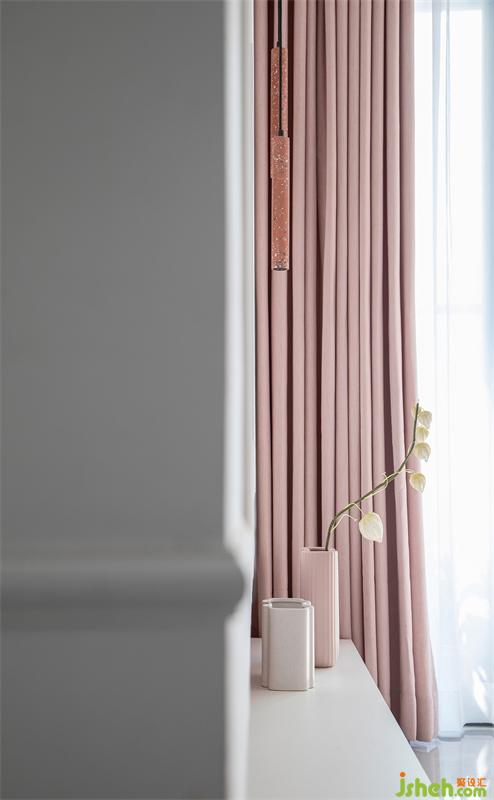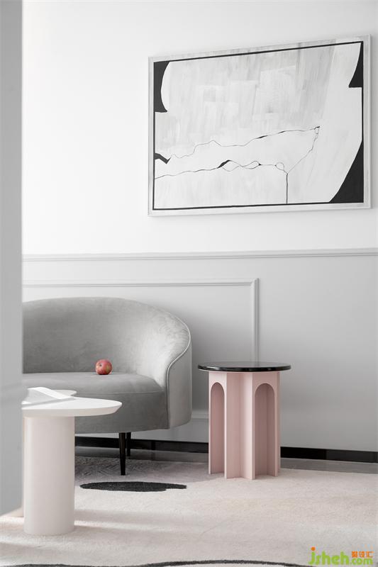 高级灰环抱式布艺沙发搭配脏粉色烤漆边几,温柔可爱的气息扑面而来。脏粉色有一种跨越年龄的轻熟魅力,于高级灰和白色之间点缀,使空间呈现高级的甜美。