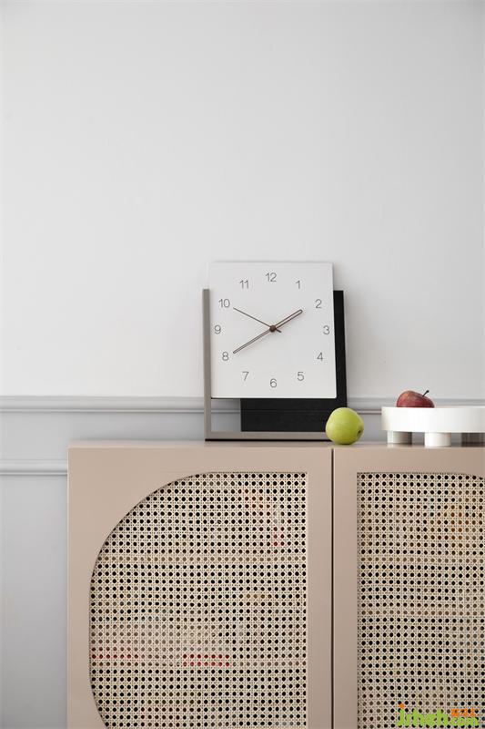 设计师以简约的设计手法诠释优雅知性。格栅排布的电视墙,透过白色纱帘的自然光线,令视觉更富有层次感。精致的石膏背景墙与清爽的乳胶漆基底,在高级灰色调的渲染之下,散发出简约又不乏优雅的气息。