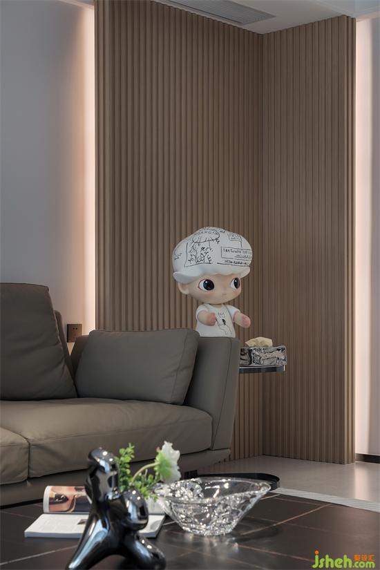 奶呼呼的潮牌玩偶谁能不爱呢!一定要摆放在最醒目的位置!木格栅从沙发墙连接到转角位置,内嵌灯带使得这个角落更有氛围感。