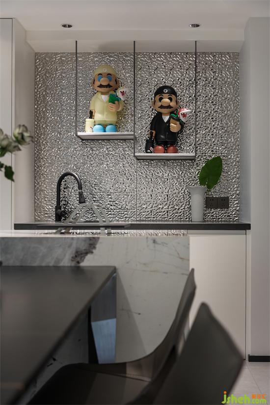 与简洁的柜子相比,水吧台上的水波纹背景墙格外显眼,与沙发墙的水波纹墙饰相呼应,无形中提升纵深感。深圳家装设计其上设计了悬空吊架,可以展示收藏的公仔,美观又实用。