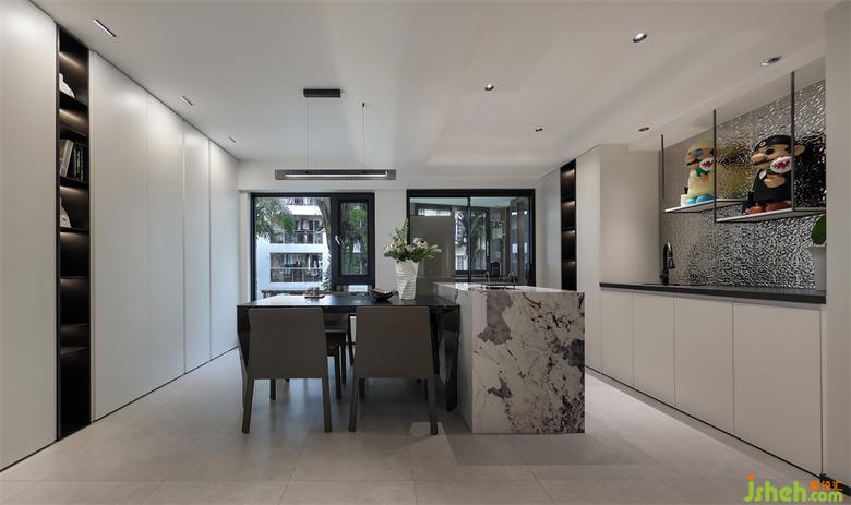 原厨房与餐厅合二为一,这里刚好又是入户区域,进门的视野非常开阔。餐厅的两端都做了整面到顶柜子,鞋柜、餐边柜、杂物收纳柜统统都有,日常囤货、收藏、展示需求都得到了满足!中心位置是岛台+可移动式餐桌的组合设计,使用更加灵活方便。