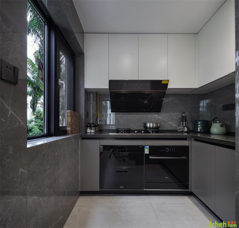 厨房区域简洁又灵动,L形的操作台面动线流畅、易于使用,将空间利用率最大化。深圳家装设计厨房小帮手们也有自己专属的位置,煎炒烹炸都不在话下!