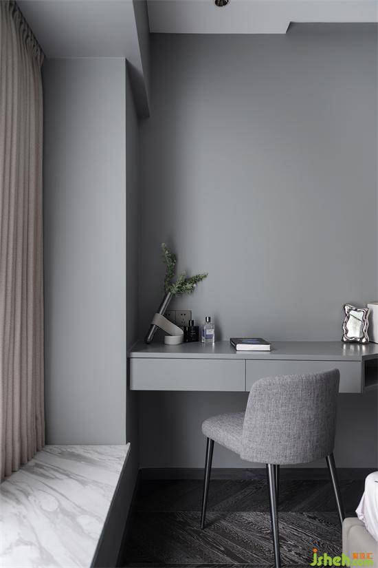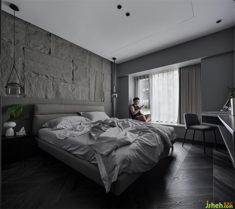 步入主卧,仿佛进入了一个深色系的松弛空间,色调很适合睡眠,全遮光窗帘更是给足了安全感,让人从身体到灵魂都很放松。深圳家装设计主卧背景墙使用了肌理感很强的石皮打底,与细腻的灰色木饰面形成鲜明对比,丰富空间层次感。在墙面与床尾之间,一个不规则形状的桌子为平时生活带来便利,木质的温润加上深邃的灰,那种随之而来的轻松氛围使人心绪宁静。