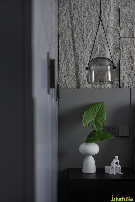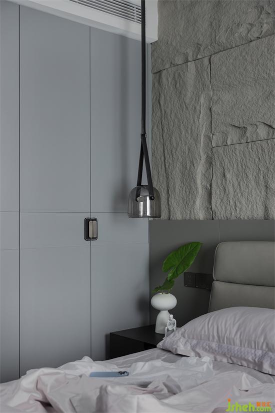 床头一侧的吊灯与床头柜上的绿植亮眼又吸睛,深圳家装设计缓解深色系空间的沉闷之感,又和墙面自然材质有所呼应,使空间更加丰富。