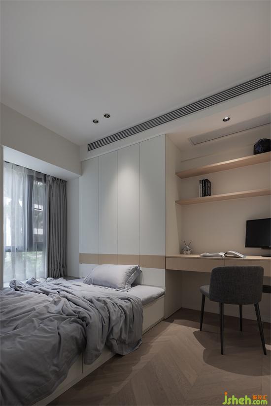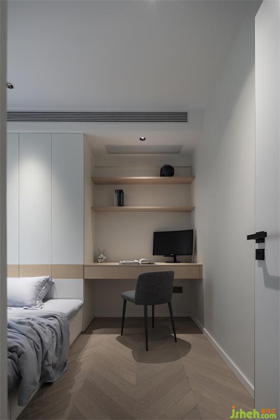 与其他房间的风格相比,次卧以一种简约而不简单的布局设计出现在了这里。靠窗的位置连接着榻榻米,深圳家装设计拓宽了使用面积。在床头和下面都做足了收纳,连桌子上方的展示架都做好了买买买的准备。
