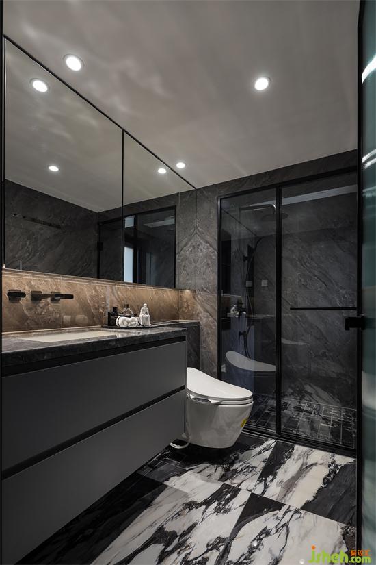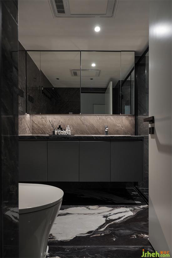 公卫延续深色系基调,深圳家装设计地面选用张力十足的熊猫大理石,瞬间将时尚感拉满。悬空浴室柜高级又好打理,搭配收纳功能强大的镜柜,美观又实用。