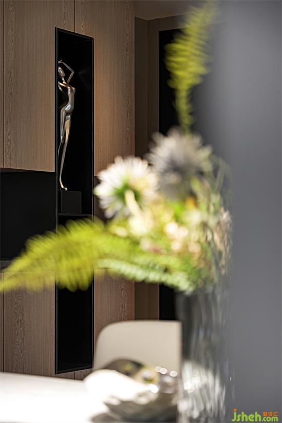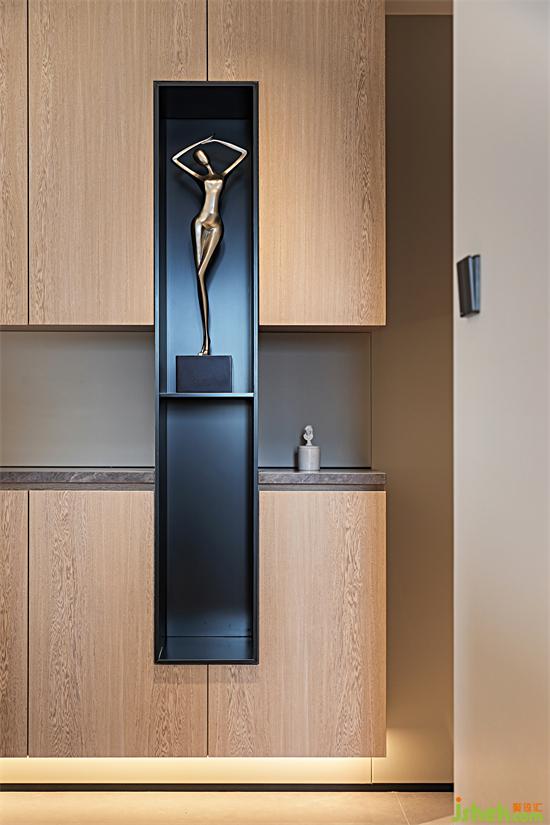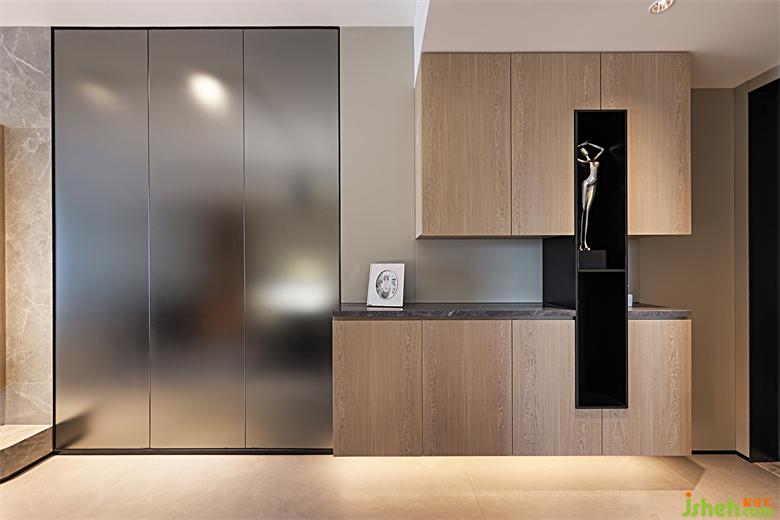 不锈钢+木质的结合提升空间质感,将鞋柜做成上下分体悬浮式造型,搭配大理石台面和连接上下柜的开放装饰格,使得鞋柜区域变得不再常规,自带非凡气质。