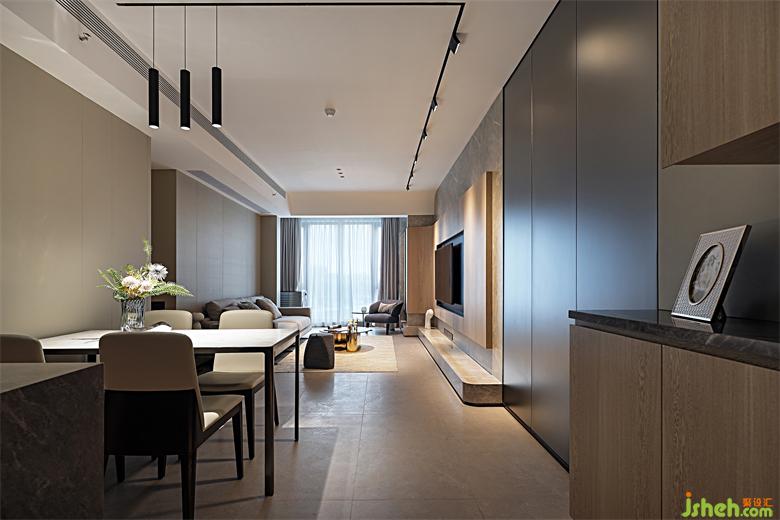 为将客餐厅这块公共区域尽可能放大,设计师可谓是煞费苦心,将连同客厅一侧的阳台融入背景墙,家装设计加大加宽背景墙尺寸,另侧直接延伸至入门鞋柜处,使得一个整面融为整体。